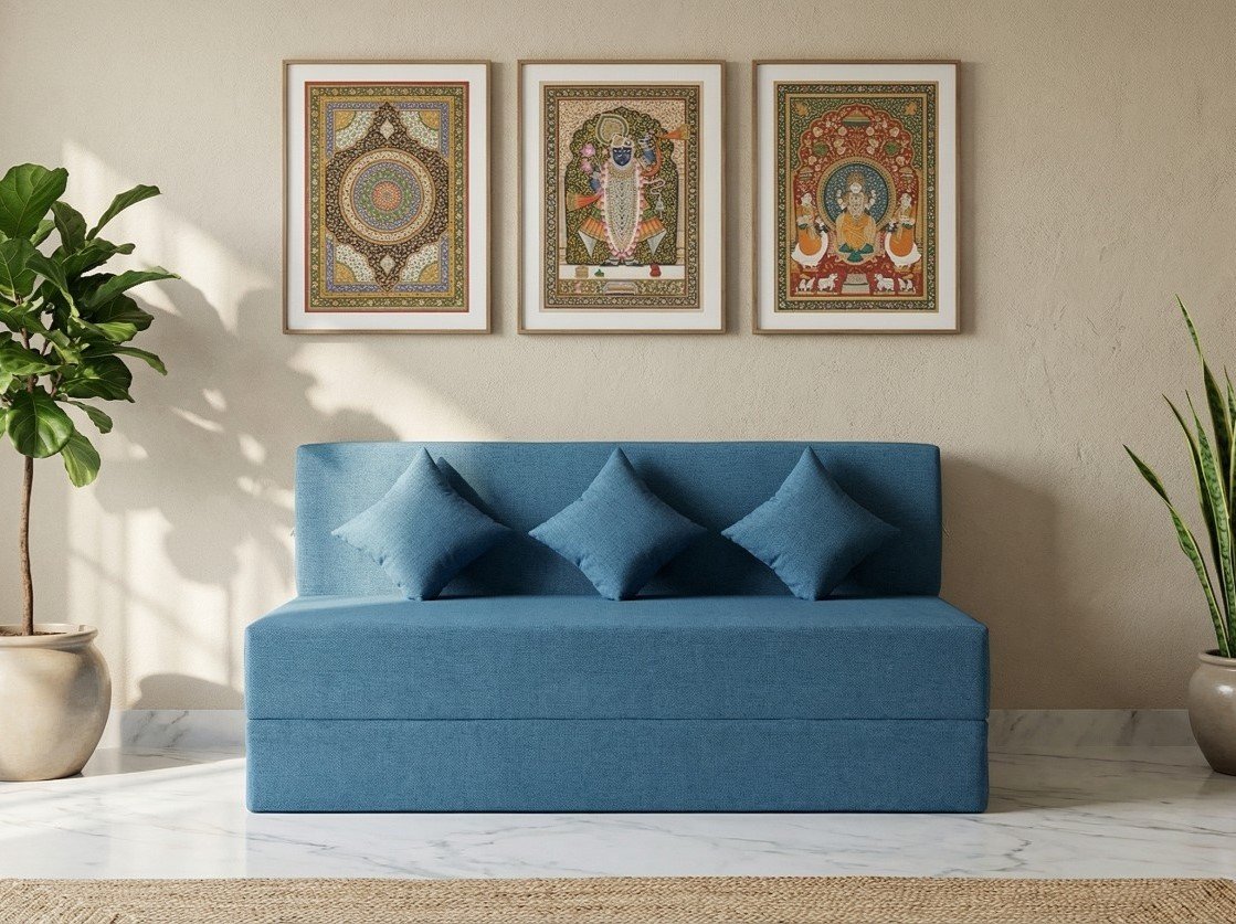 Keep the sofa cum bed away from direct heat sources and damp areas. Periodic rotation of cushions helps maintain even wear and consistent comfort.