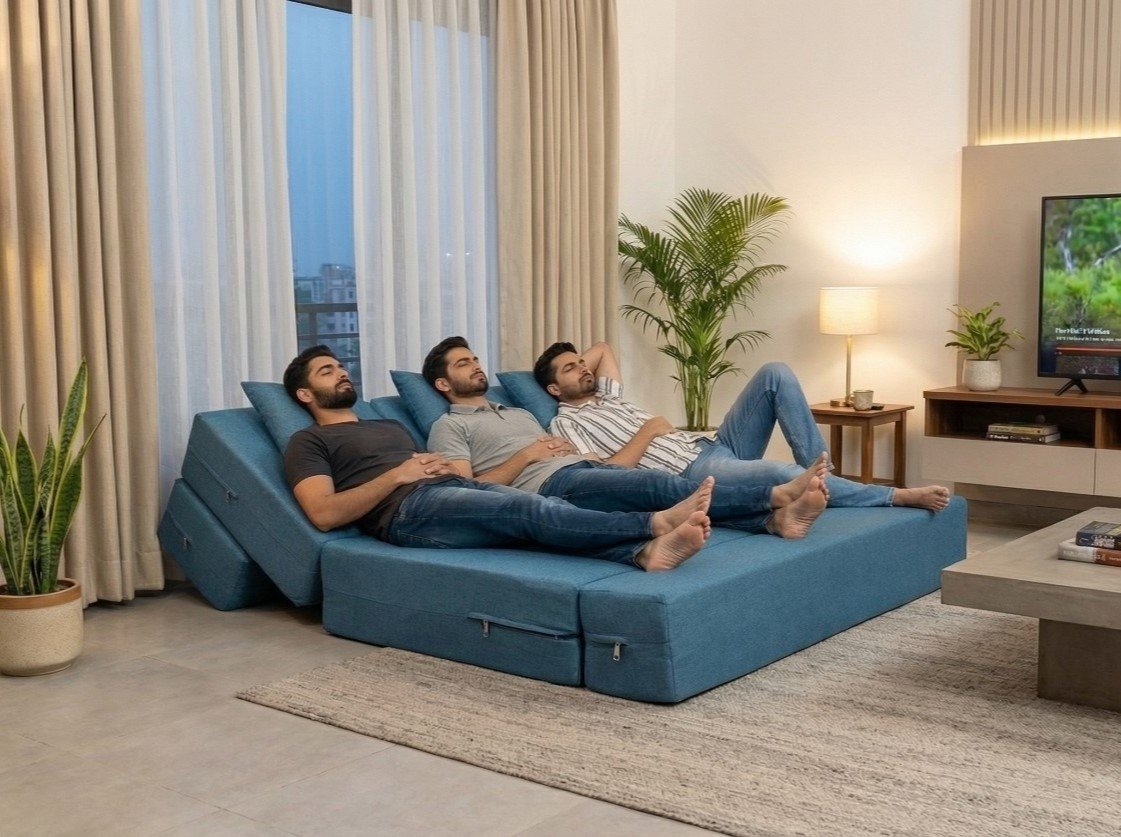 The Sofa Cum Bed is a thoughtfully designed multi-functional sofa cum bed furniture, convertible sofa bed, space-saving furniture, foldable sofa bed, modern sofa cum bed piece created to meet the needs of modern living spaces, small apartments, and compact homes. It offers four versatile usage modesβ€”Sofa Mode, Lounger Mode, Ottoman Mode, and Bed Mode, making it a complete comfort solution for everyday living. This Sofa Cum Bed smart convertible design, multi-purpose furniture, compact sofa bed solution combines style, practicality, and space efficiency in one unit.
